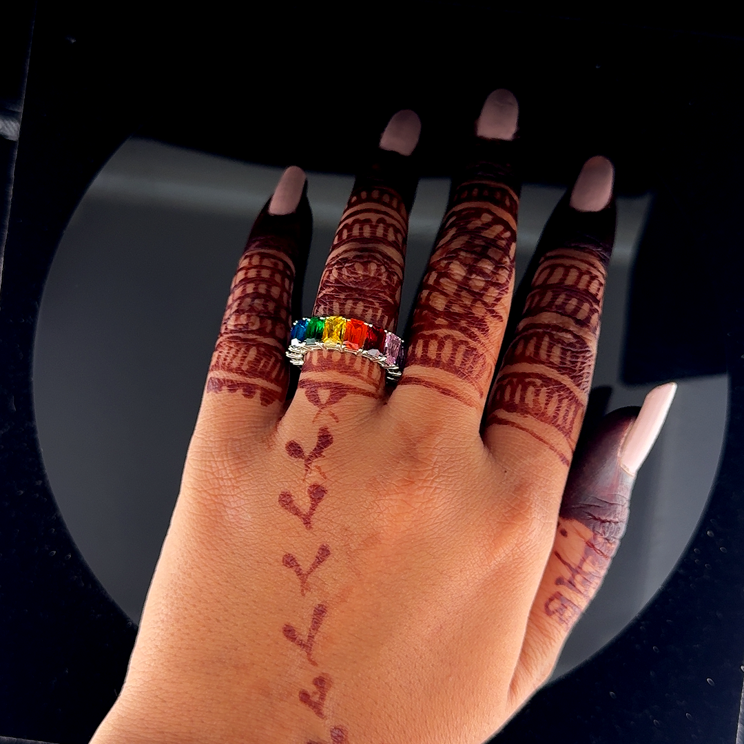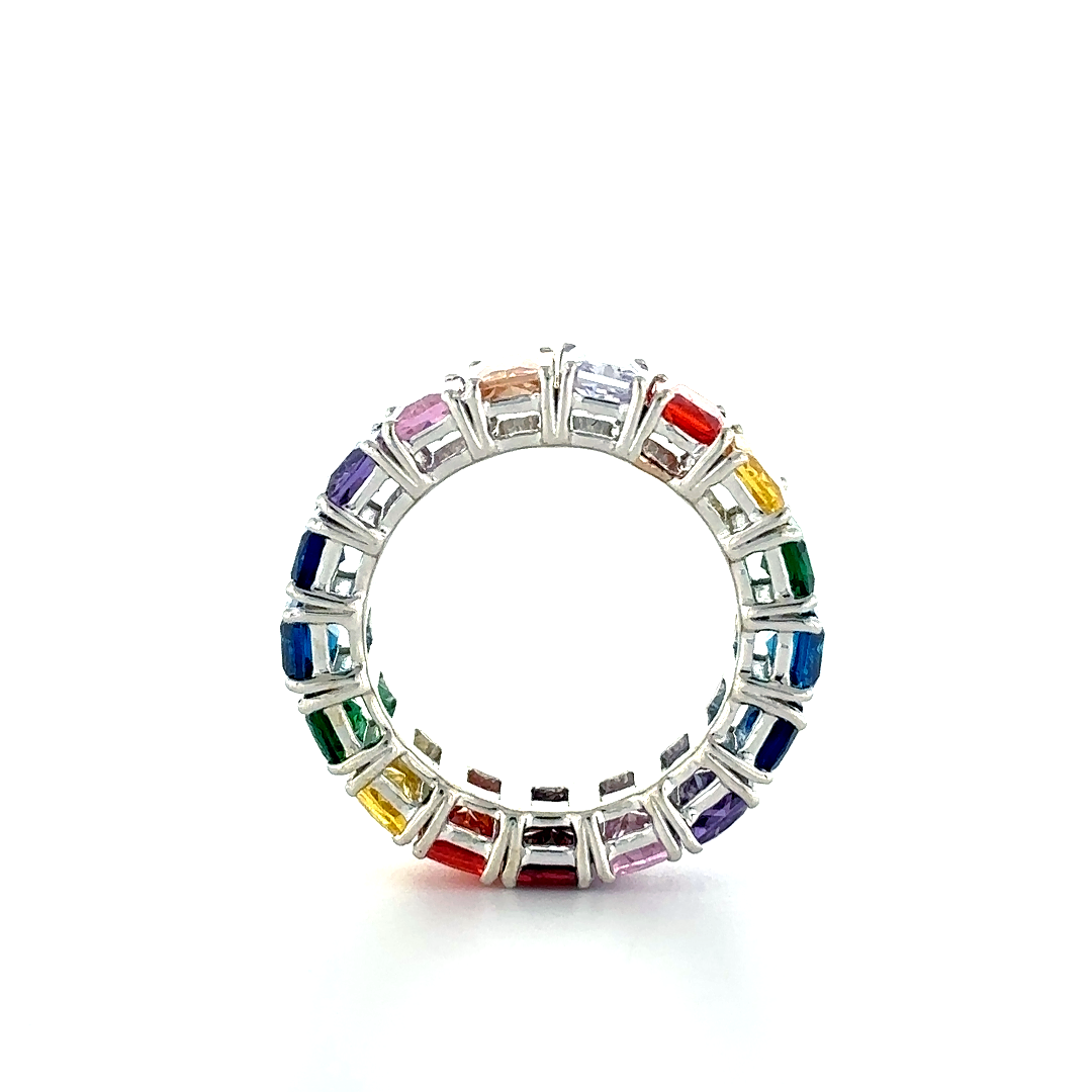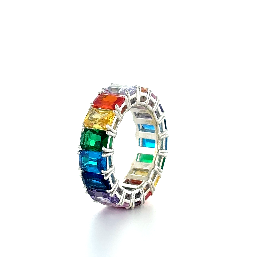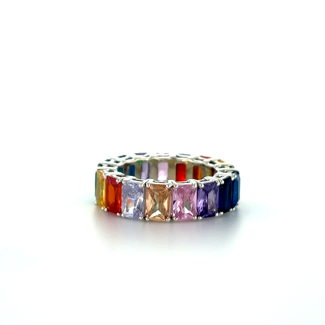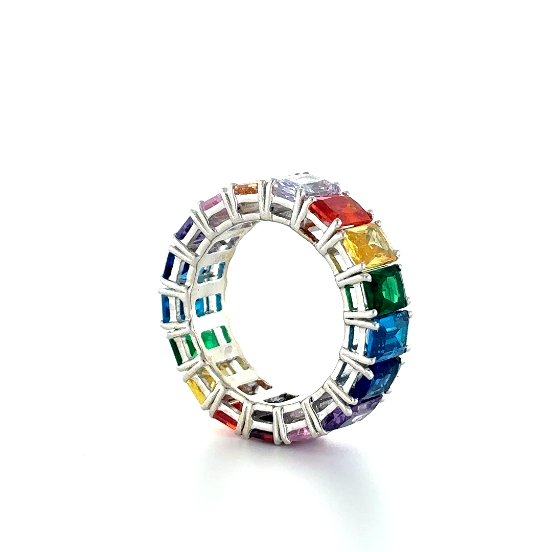 An Ashoka-shaped eternity ring in silver, set with rainbow-colored stones—vibrant, distinctive, and endlessly radiant. The ring is designed in real Silver925 and Synthetic gems.