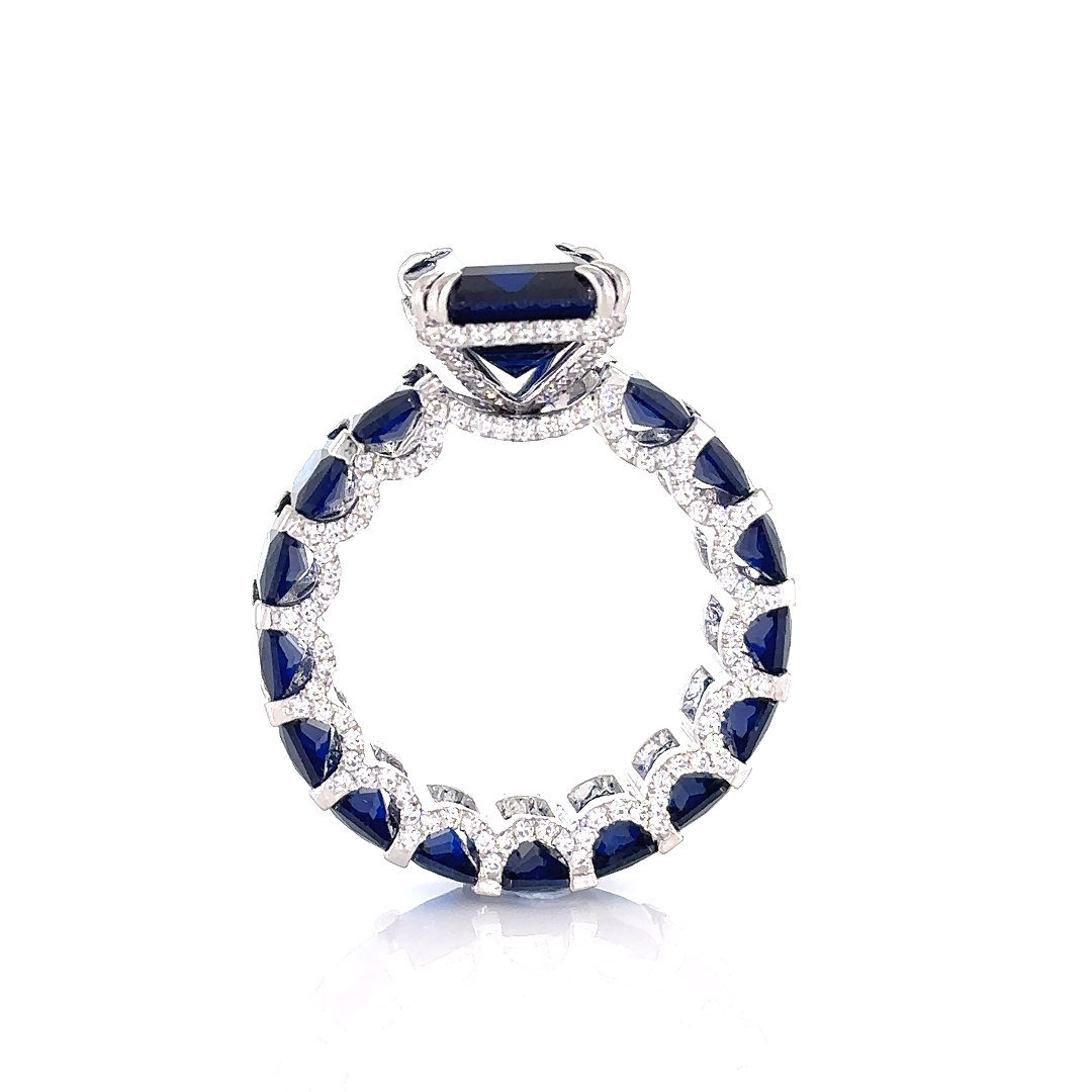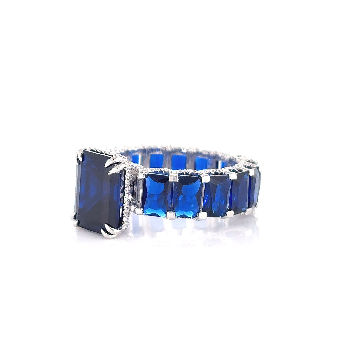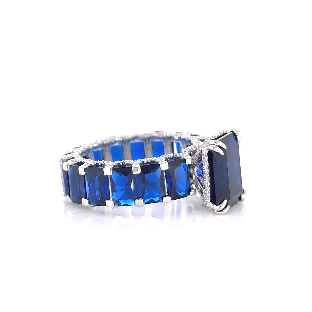 A striking blue emerald center, accented by matching stones and a cubic zirconia-studded band—rich color, layered sparkle, and refined elegance. The ring is designed in real Silver 925, Cubic zirconia and Synthetic gems.