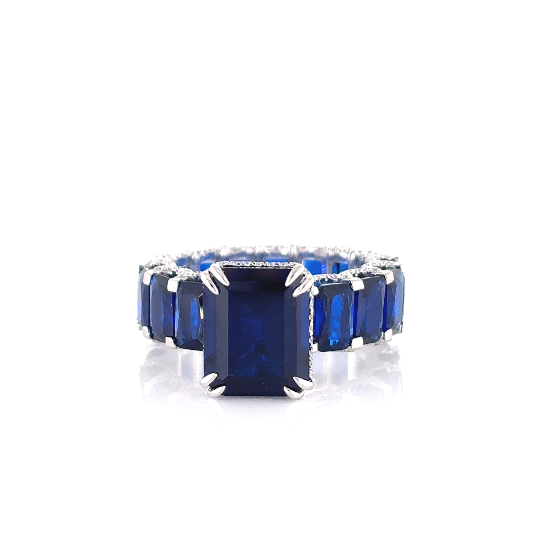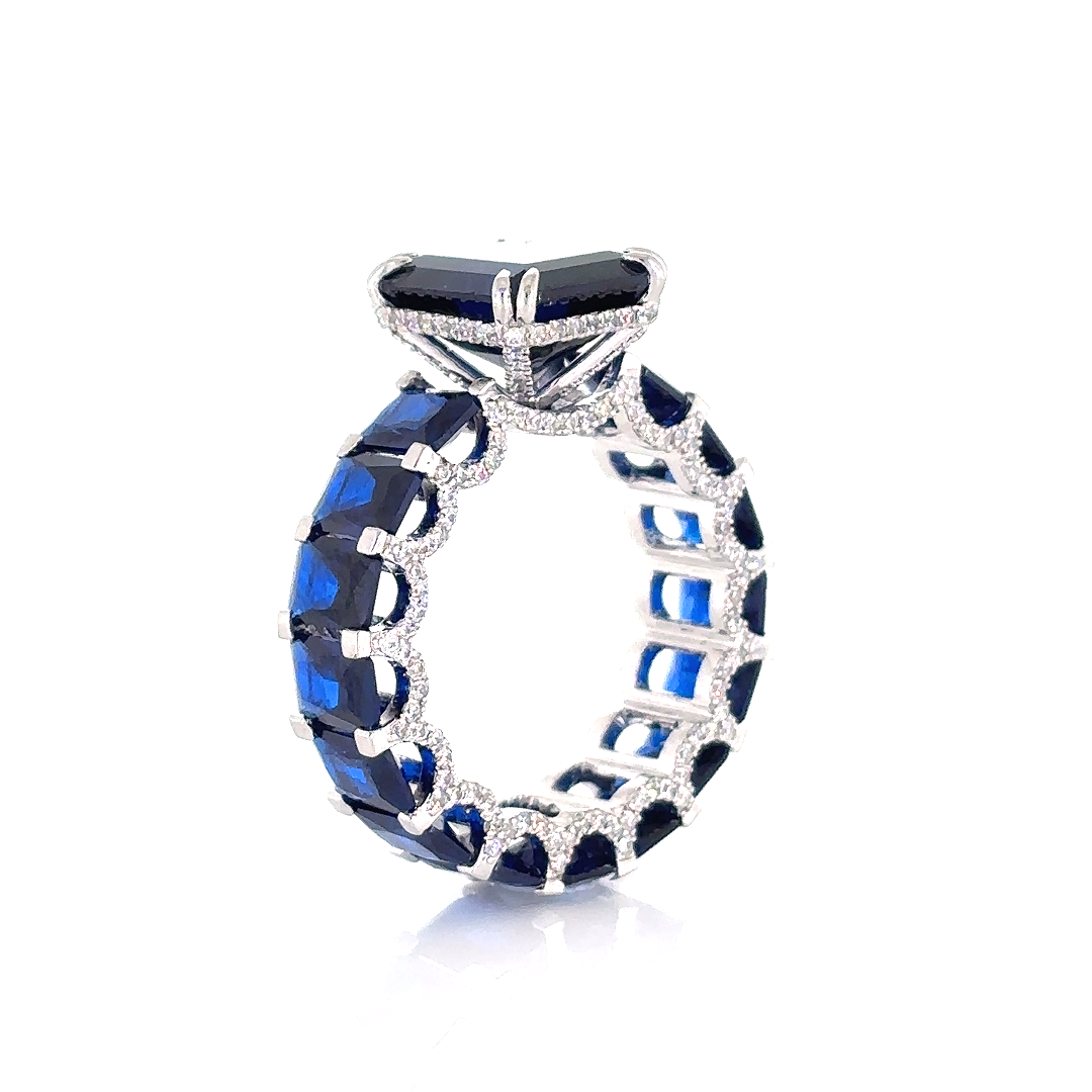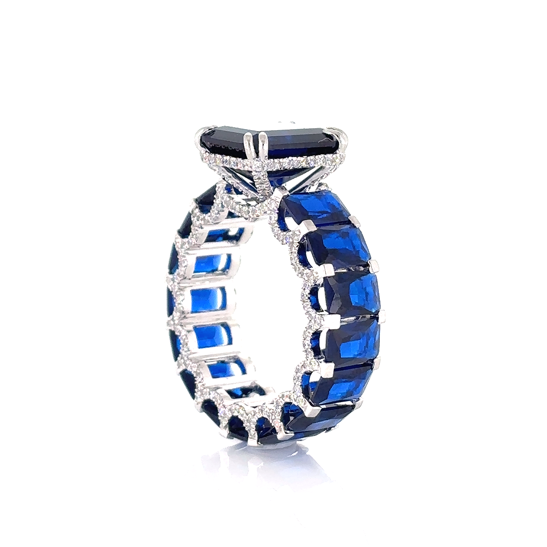 A striking blue emerald center, accented by matching stones and a cubic zirconia-studded band—rich color, layered sparkle, and refined elegance. The ring is designed in real Silver 925, Cubic zirconia and Synthetic gems.