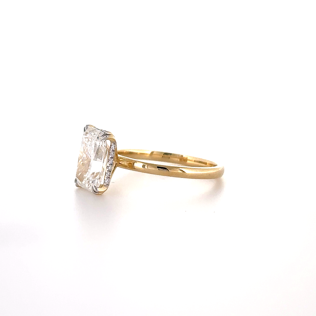 A radiant-cut diamond takes center stage, enhanced by a hidden halo that reveals a subtle sparkle—where bold brilliance meets understated elegance. The ring is designed in real 14k yellow gold and Lab grown diamond.