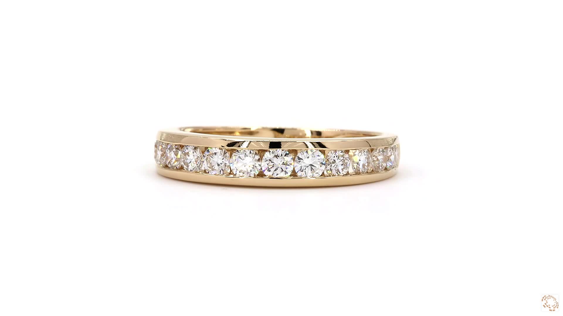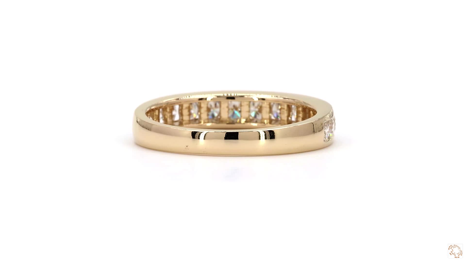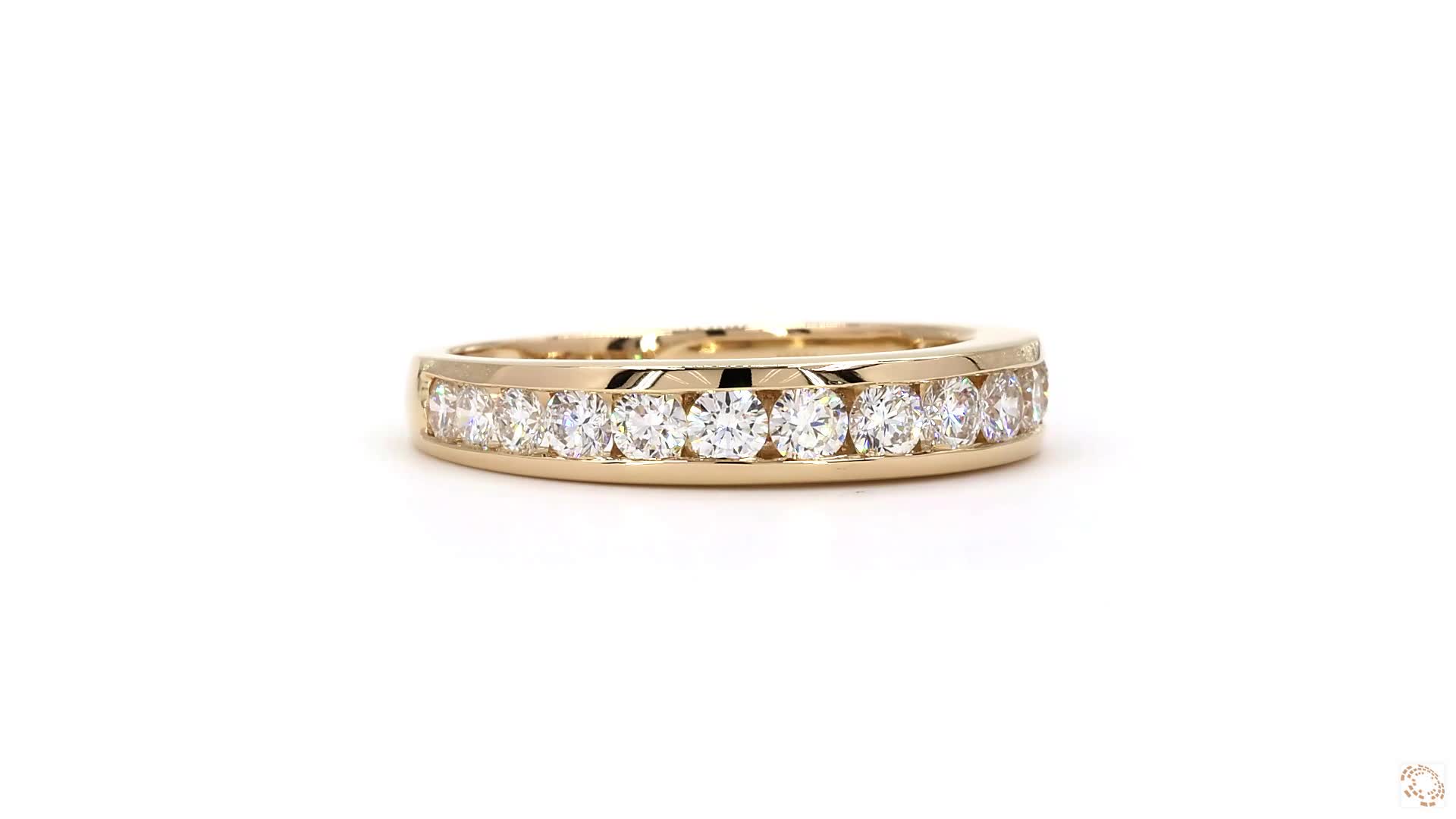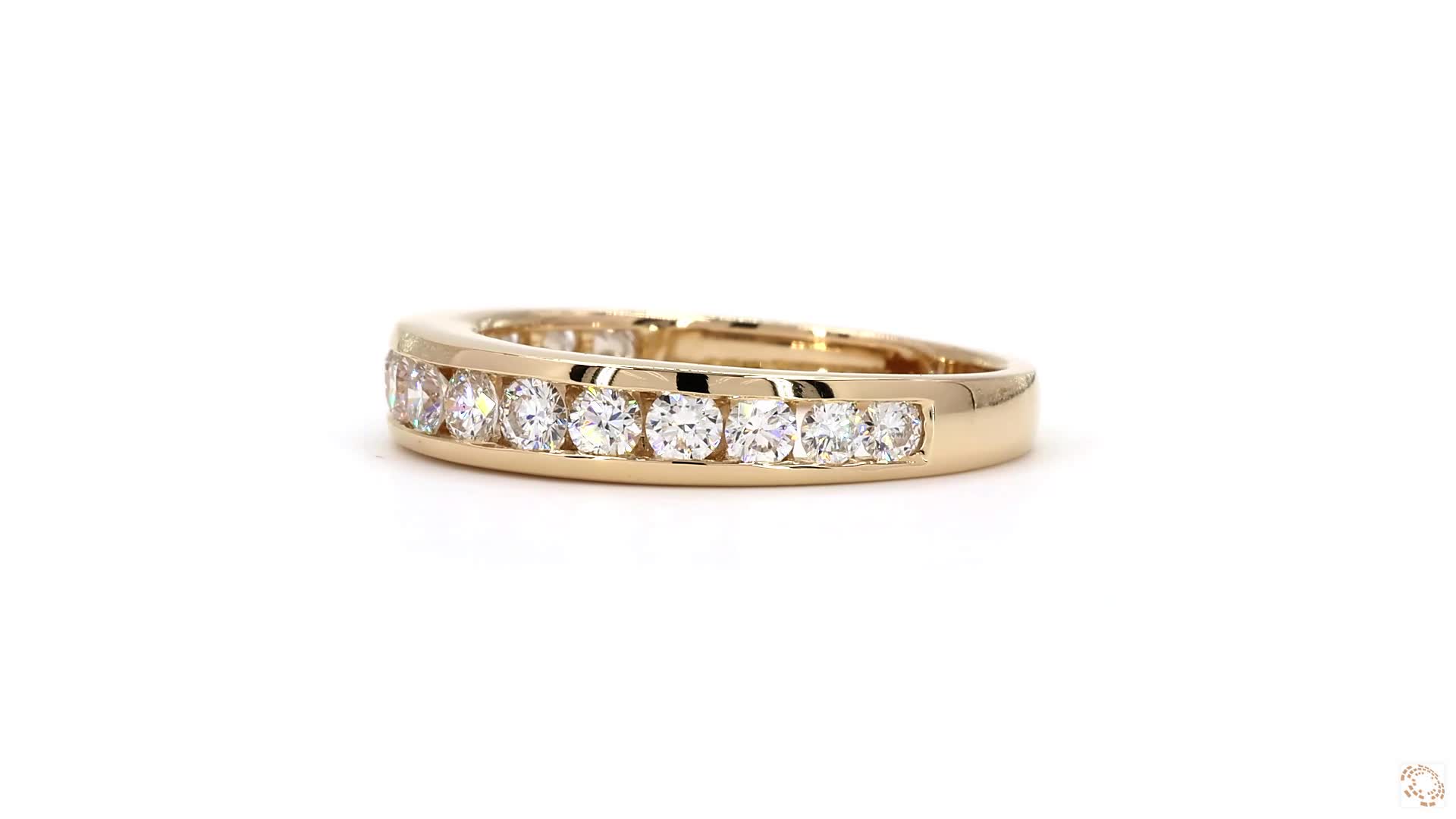 Round-cut diamonds set in a sleek channel, flowing 3/4 around the band—offering a seamless line of brilliance with timeless sophistication. The ring is designed in real 14k yellow gold and Lab grown diamond.