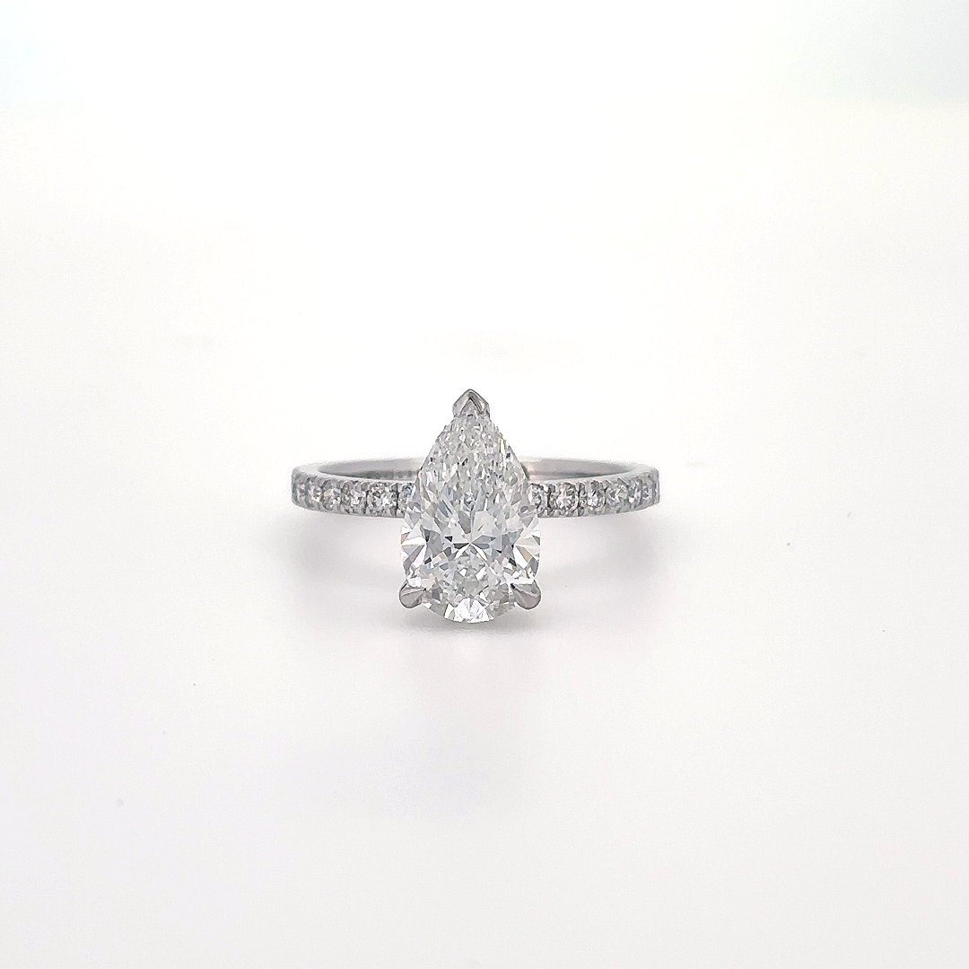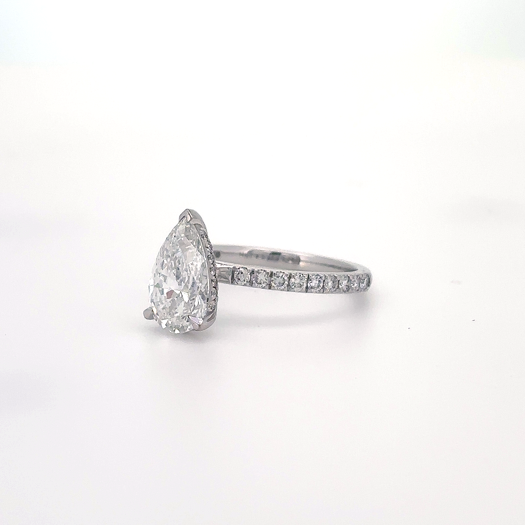 A captivating pear-cut center elevated by a hidden halo, set on a diamond-studded pave band—graceful brilliance with a touch of hidden sparkle. The ring is designed in real 14k white gold and Lab grown diamond.