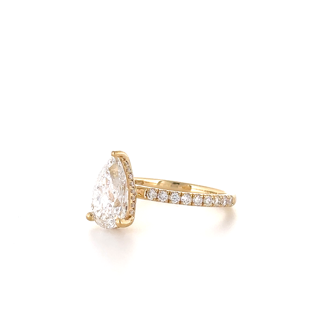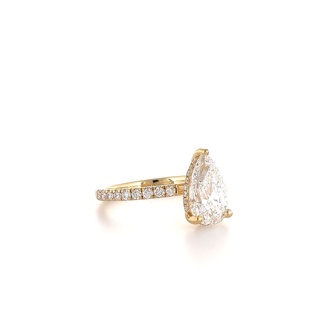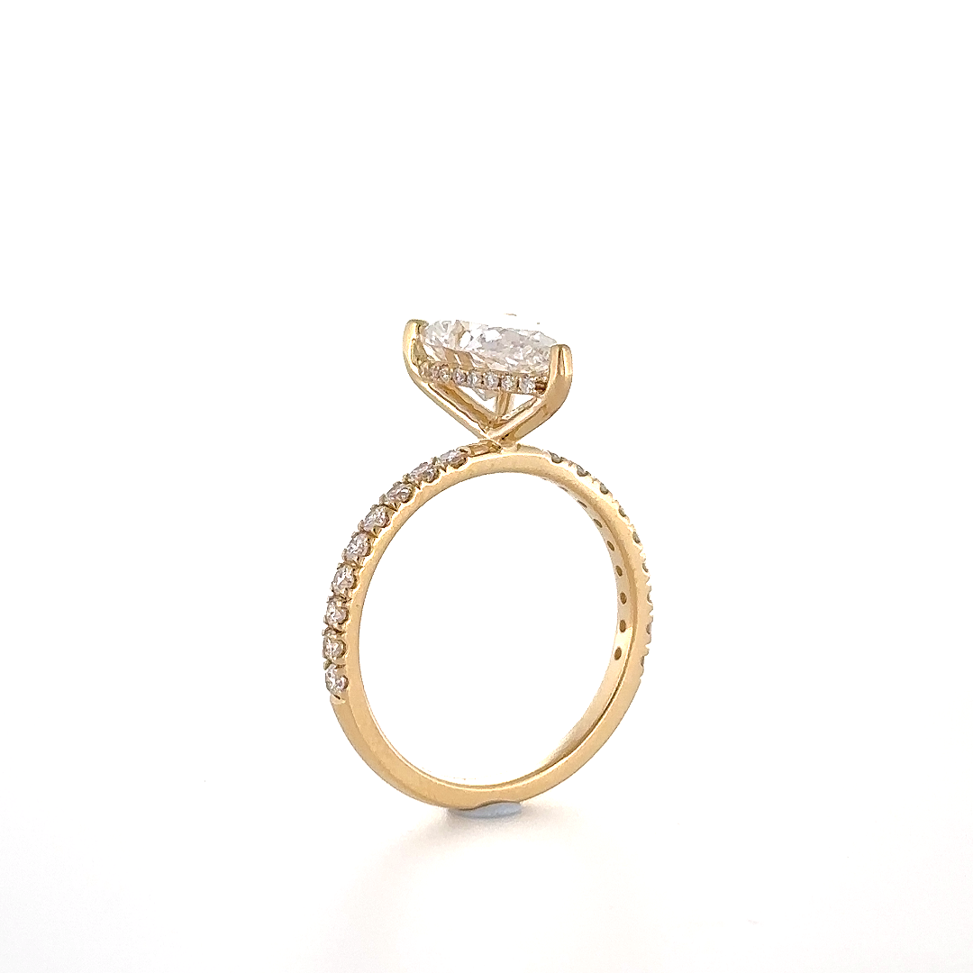 A captivating pear-cut center elevated by a hidden halo, set on a diamond-studded pave band—graceful brilliance with a touch of hidden sparkle. The ring is designed in real 14k yellow gold and Lab grown diamond.
