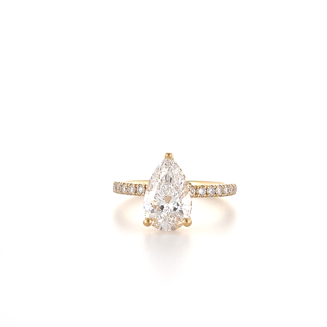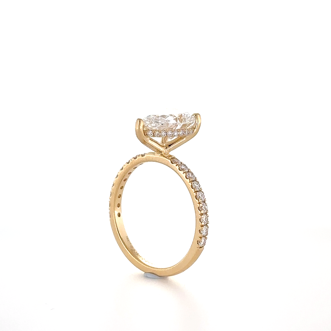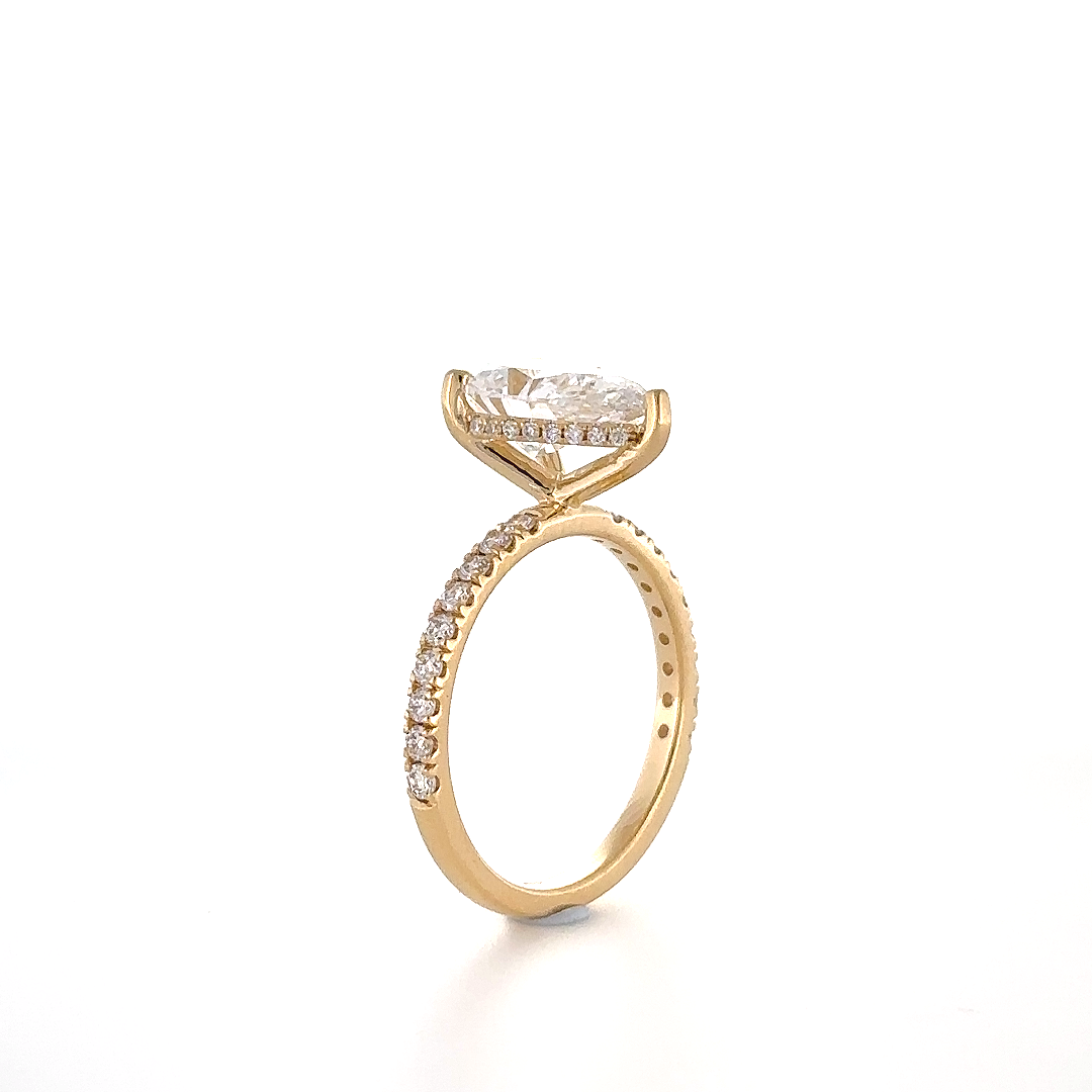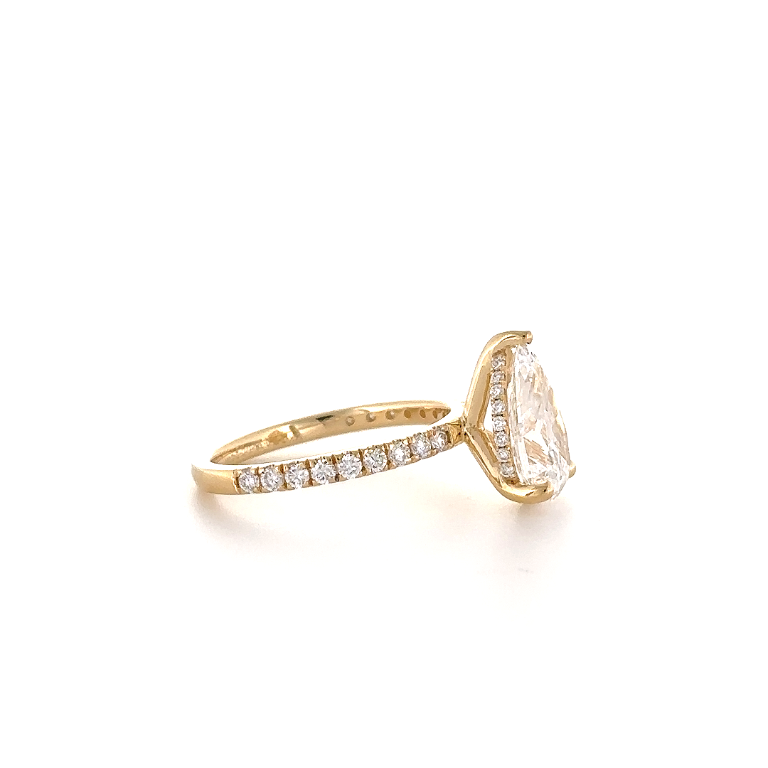 A captivating pear-cut center elevated by a hidden halo, set on a diamond-studded pave band—graceful brilliance with a touch of hidden sparkle. The ring is designed in real 14k yellow gold and Lab grown diamond.