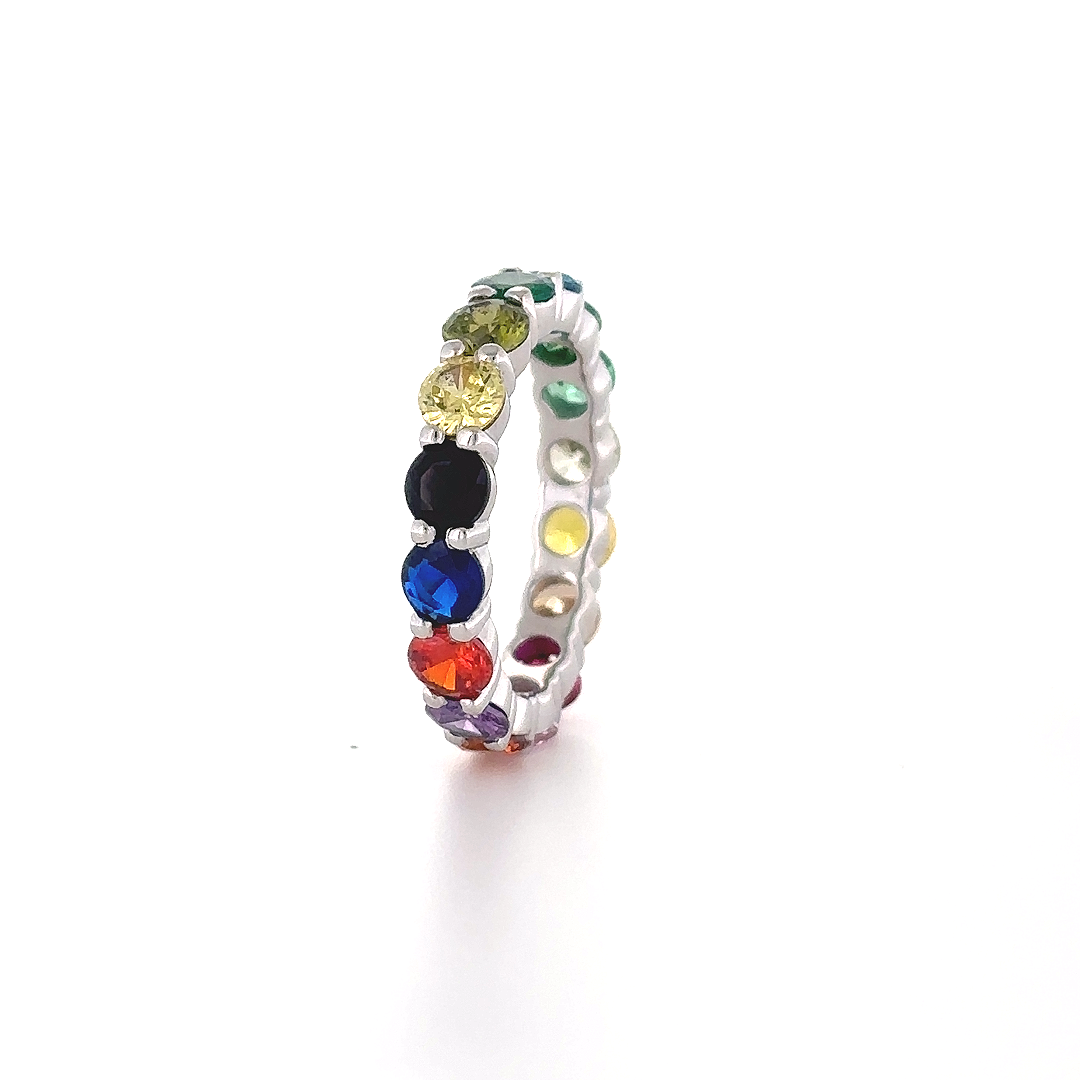 A vibrant eternity band in silver, adorned with a spectrum of multicolored gemstones—playful, radiant, and endlessly charming. The ring is designed in real Silver 925 and Synthetic gems.
