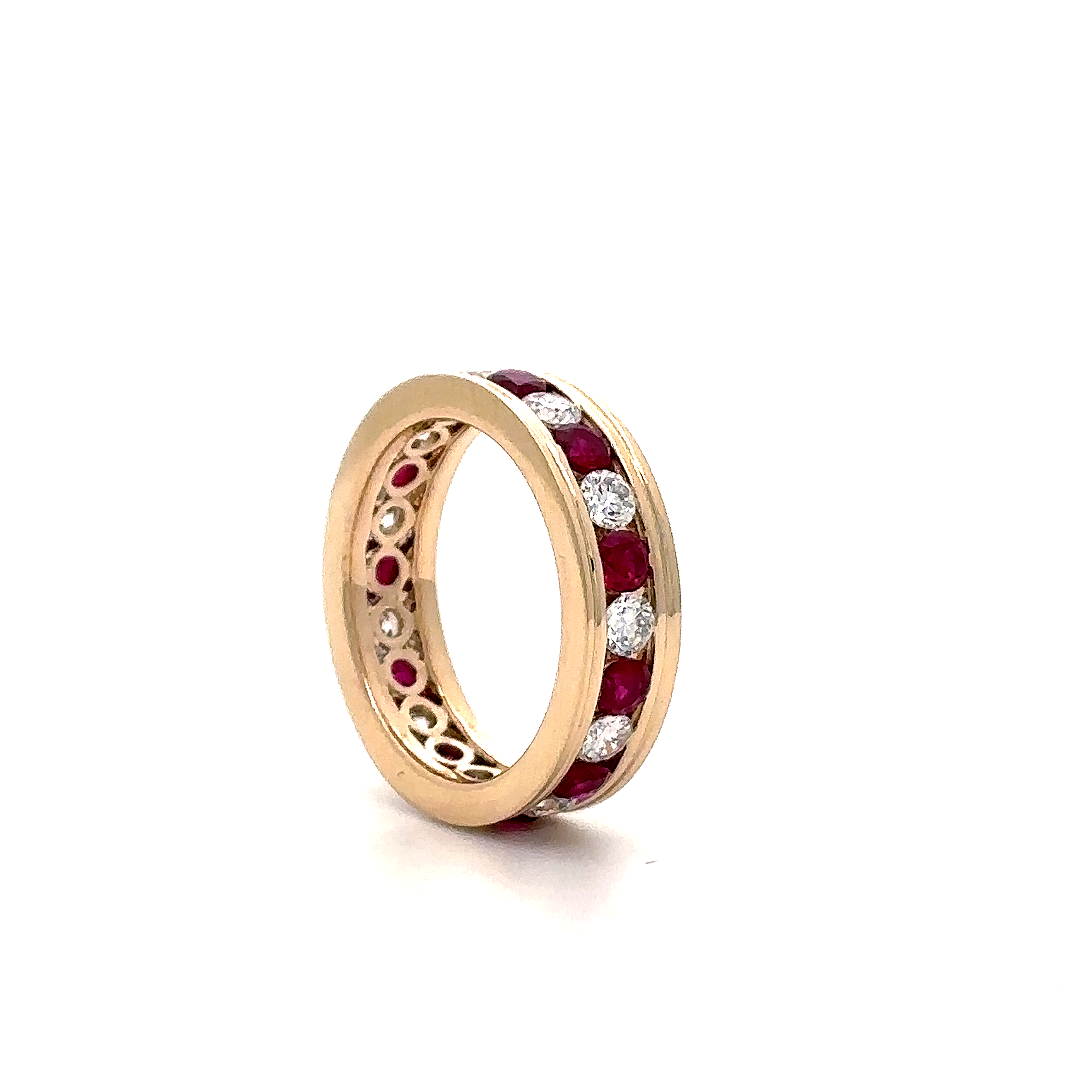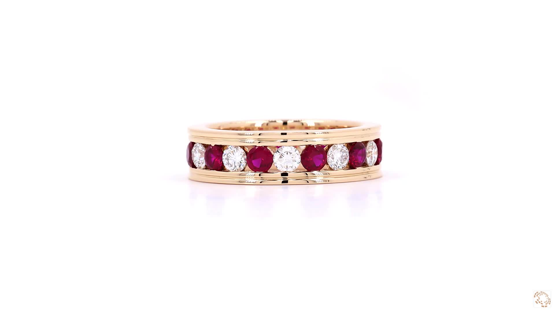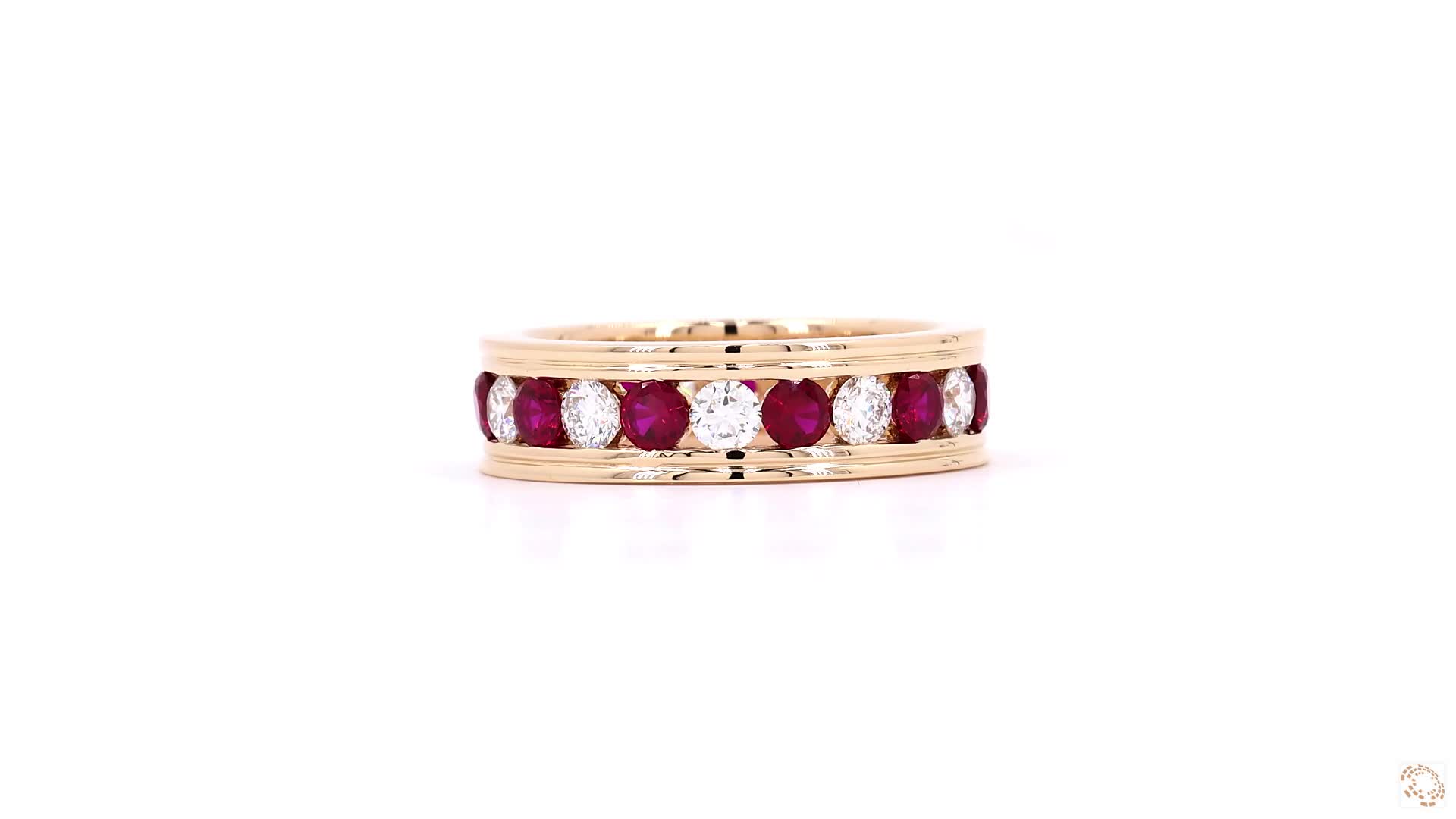 A vibrant rhythm of rich rubies and round diamonds encircles the band—an eternity of color, brilliance, and timeless elegance. The ring is set in real 14k yellow gold, Synthetic gems and Lab grown diamond.
