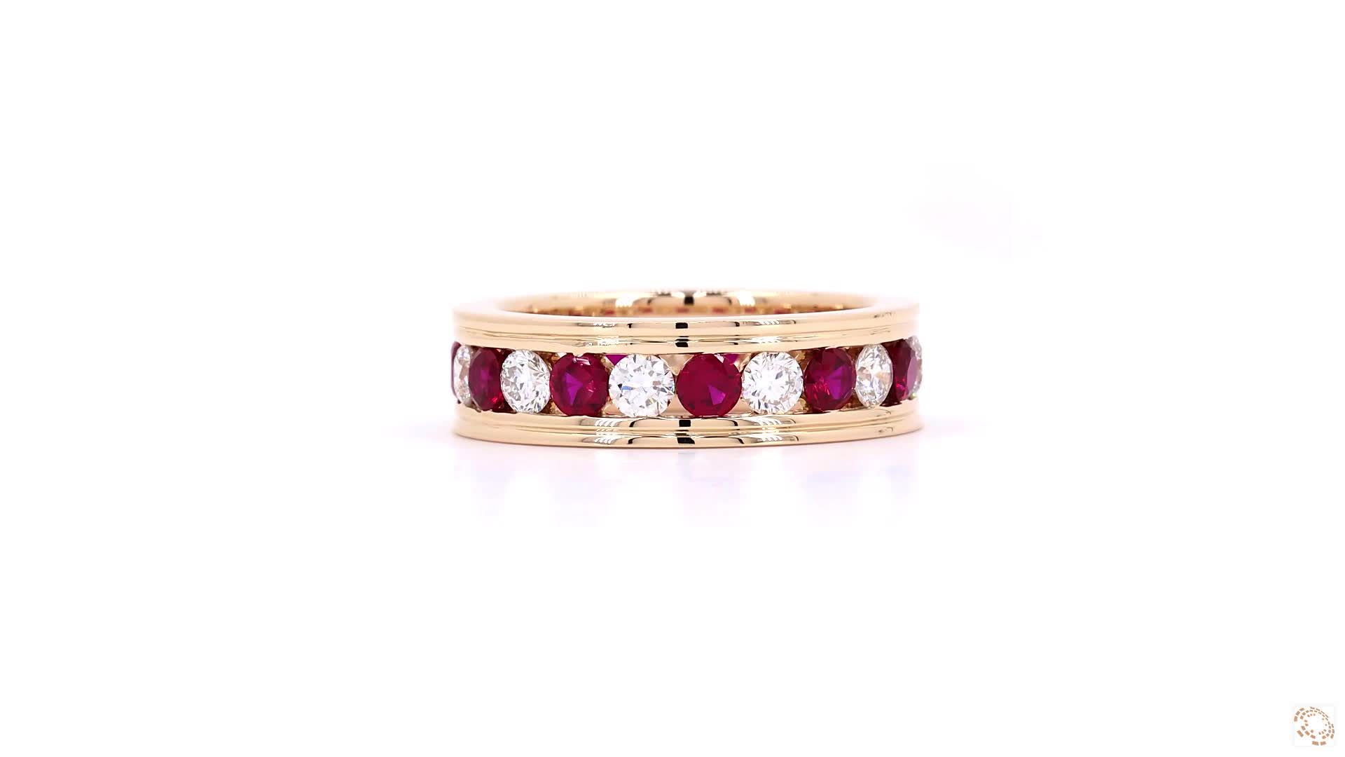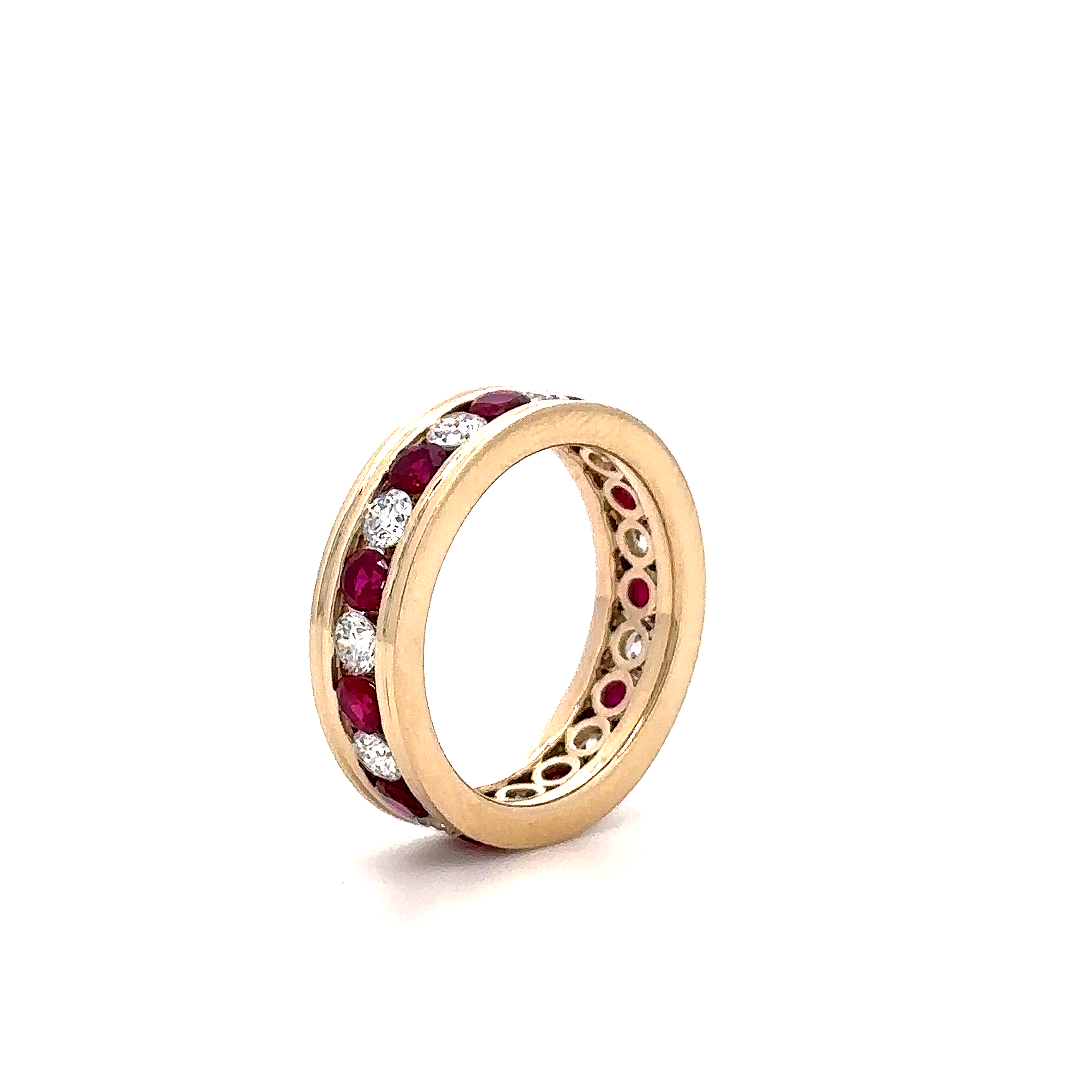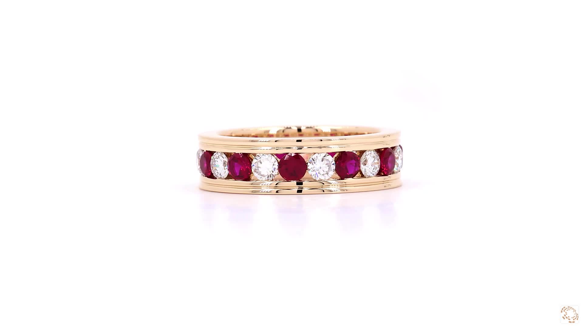 A vibrant rhythm of rich rubies and round diamonds encircles the band—an eternity of color, brilliance, and timeless elegance. The ring is set in real 14k yellow gold, Synthetic gems and Lab grown diamond.
