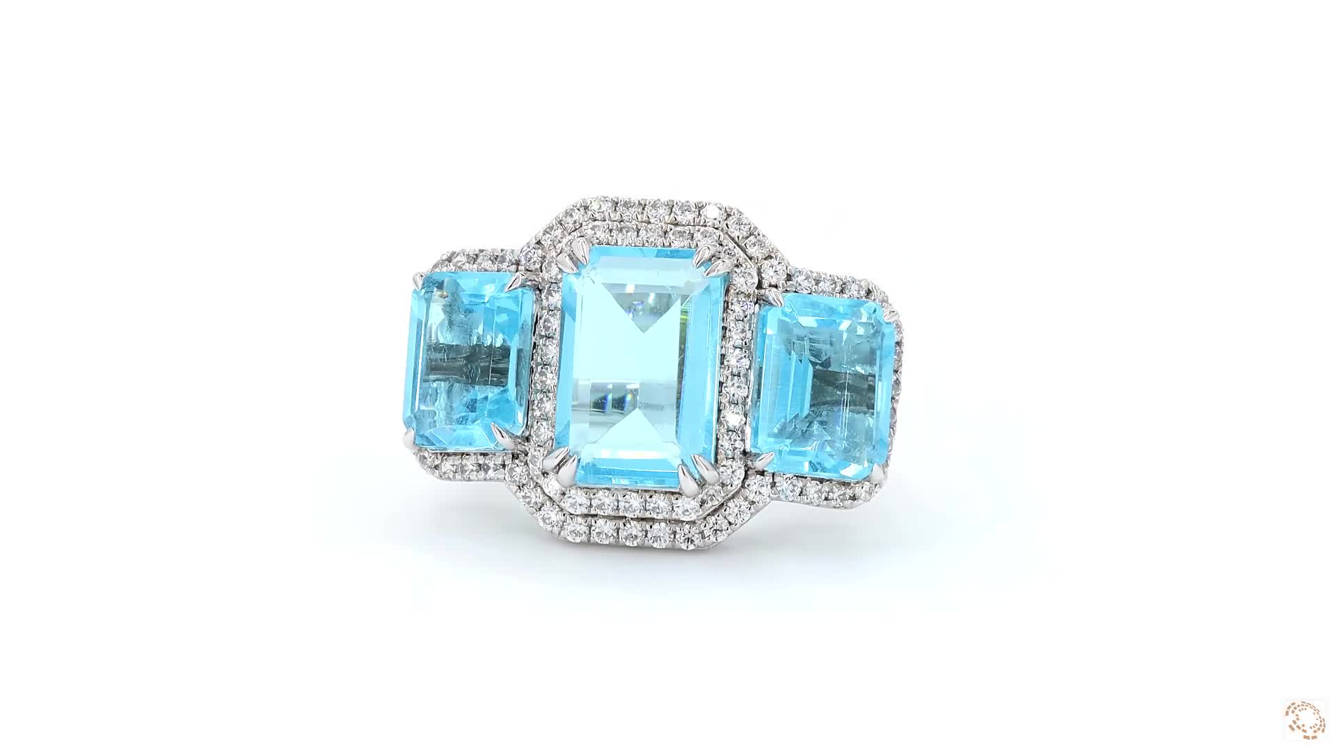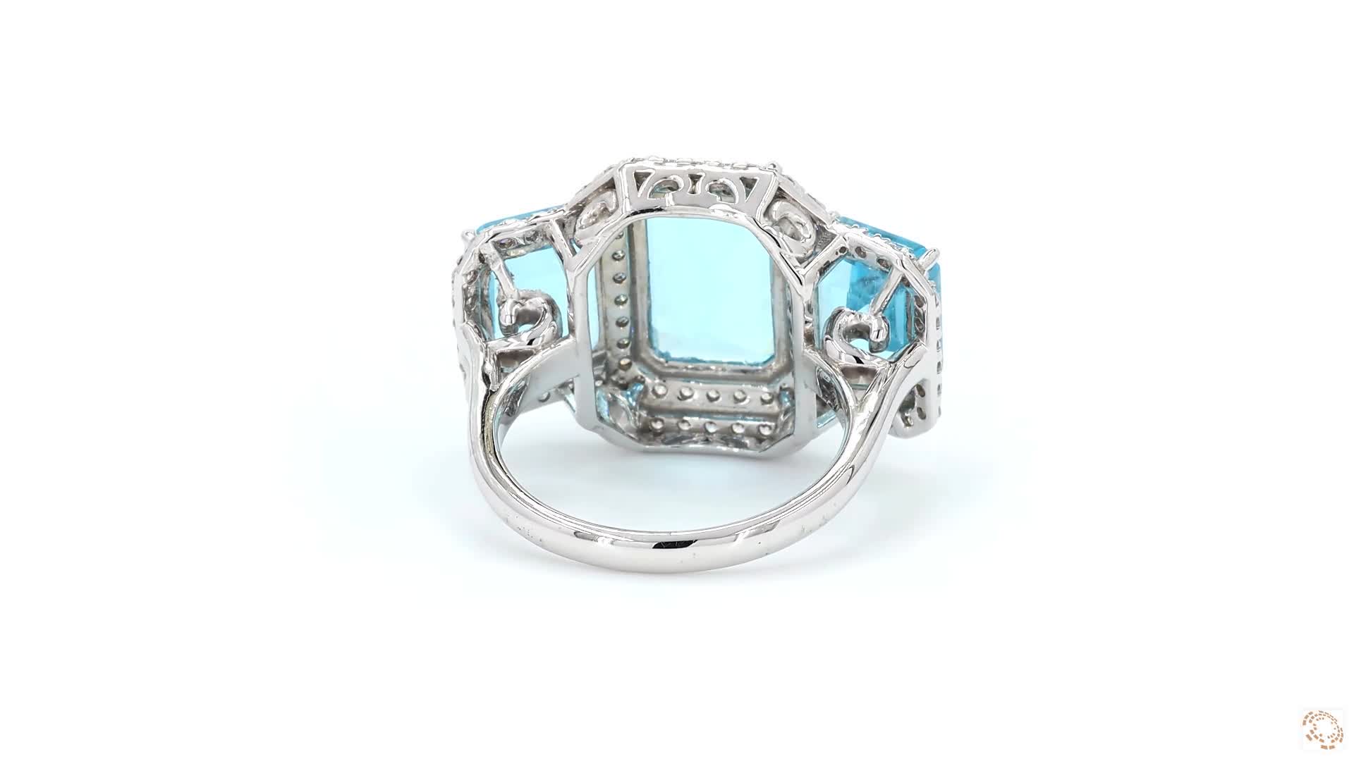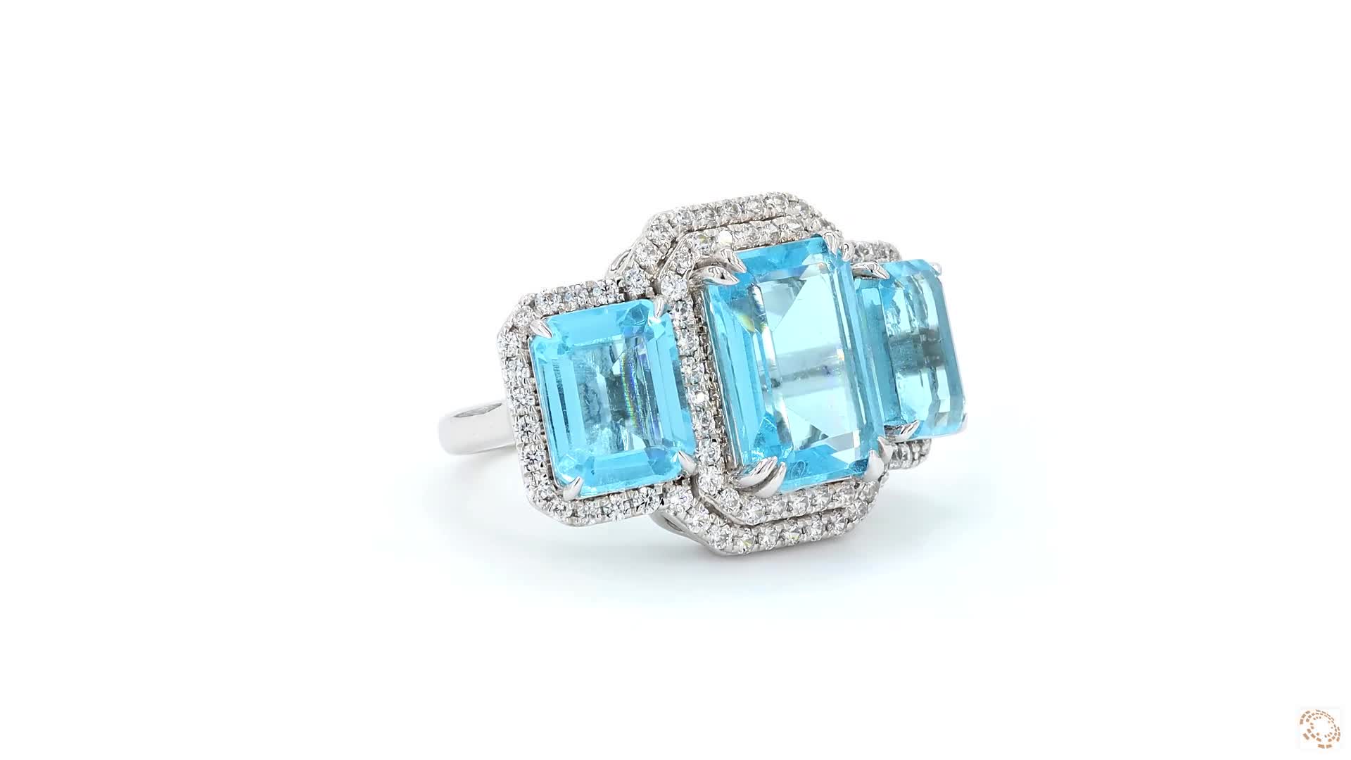 Three captivating blue emerald gemstones take center stage, each encircled by a sparkling cubic zirconia halo—rich color, radiant brilliance, and timeless elegance in every detail. The ring is designed in real Silver 925, Synthetic gems and Cubic zirconia.